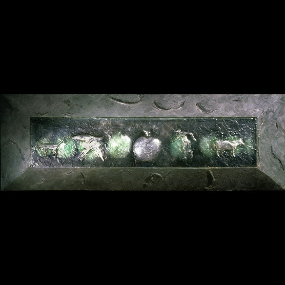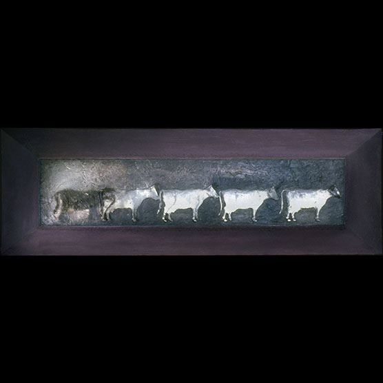 "Cows" , 89 , 12” x 40” x 5” , Kiln cast glass , steel , oil paint