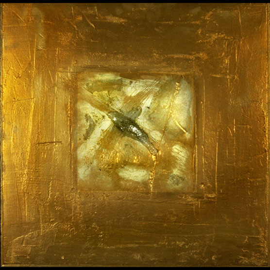 “Bird In Gold” , 88 , 20" x 20". , Kiln cast glass , wood , enamel paint on wood.
