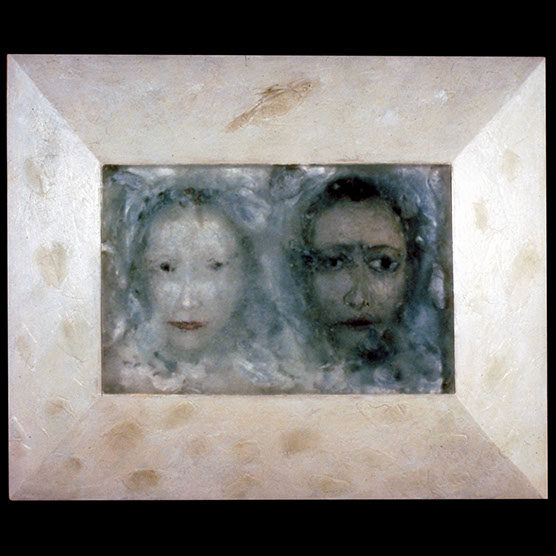 “Double Portrait” , 91 , 24.5” x 29.5" , Kiln cast glass, wood, oil paint, enamel paint.