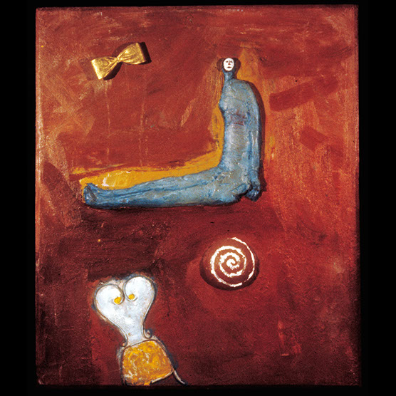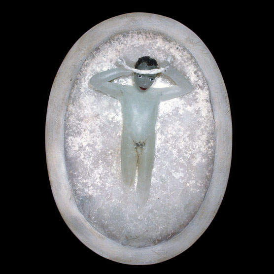 Her Laughter , 87 , 86X71 cm. , Kiln cast glass , wood , oil paint
