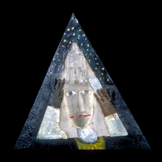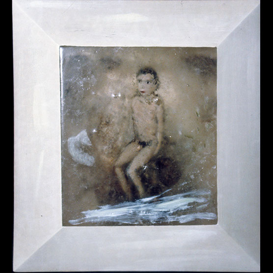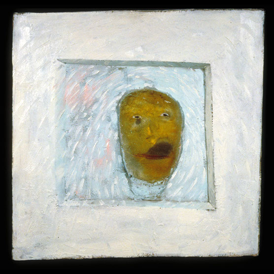 “Innocent” , 92 , 22x20 , Kiln cast glass, wood, oil paint,enamel paint.